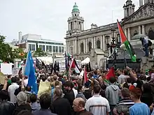 - ↑ "Demo held over Gaza flotilla attack". Belfast Telegraph. Retrieved 2 June 2010.