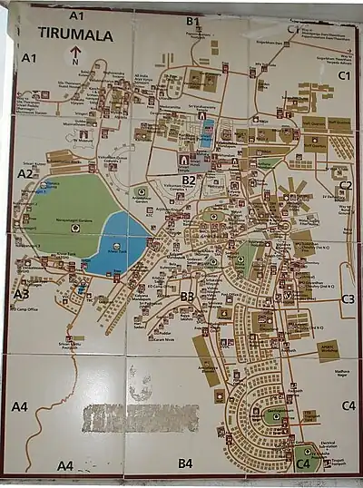 Map of Thirumala – the arch is close to Varahaswamy temple in B1 block in the map and is one kilometre from north of the main shrine of Lord Venkateshwara