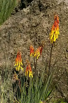 The timberline forest is usually found between 3,000 metres (9,800 ft) and 3,500 metres (11,500 ft), although it extends to lower altitudes on the drier slopes.[1] Smaller trees dominate in the timberline forest, and the characteristic trees are African rosewood (Hagenia abyssinica, Kik. mũmondo, mũthithikũ[12]) and giant St. John's wort (Hypericum). The common flowers are red-hot poker (Kniphofia thomsonii), violets (Viola spp.), and giant forest lobelias (Lobelia bambuseti and Lobelia giberroa (Kik. mũhehe)[12]).[1][9]