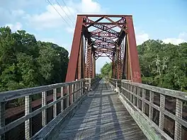 The Nature Coast State Trail (NCST) is a 31.7-mile long segment of Florida's Statewide System of Greenways and Trails System built along abandoned railroad tracks,[2] and designated by the U.S. Department of the Interior as a National Recreation Trail.[3][4] It has two primary sections following unused rail lines that were originally built by the Atlantic Coast Line Railroad. It includes historic sites such as a 1902 train trestle bridge over the Suwannee River[5] near Old Town and train stations in Trenton, Cross City, and Chiefland. At Wilcox Junction abandoned rail tracks cross and connect with several communities. The trail is available to hikers, cyclists, and horse riders.[6]