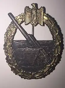 The Naval Artillery War Badge or War Badge for the Coastal Artillery (German: Kriegsabzeichen für die Marineartillerie) was a World War II German military decoration awarded to the crews of Kriegsmarine land-based marine artillery and anti-aircraft units.[1][2] It was presented to personnel of coastal defense units, and anti-aircraft units. The award was instituted on 24 June 1941 by Grand Admiral Erich Raeder to reward the actions of both individuals and crew members.[2] It was also awarded to those killed in action in said units.[1]
