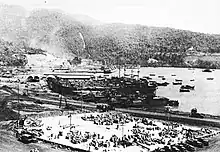 The Battle of Hollandia started on April 22, 1944, as part of the New Guinea campaign. [3] United States Armed Forces as part of Operation Persecution landed at both Humboldt Bay and Tanahmerah Bay, 12 miles west of Humboldt Bay. Both bays are in a rain Tropical rainforest climate. On May 9, the Seabee 113th Construction Battalion arrived at Humboldt Bay and start construction on the port and docking facilities. Buildings and roads were built at the port base camp. A power station, water purification, Seabee camp and depot were built. To receive all the needed supplies for the new Naval Base a pier for Merchant Navy ships was built and completed on June 9. To prepare for the staging of troops, a second pier was built, starting September 13 and completed on November 23. A destroyer repair base was completed on September 1. Seabee 102rd Construction Battalion arrived at Humboldt Bay on June 12, 1944, to speed up construction projects. To expand the base a major land fill project was done into the bay. Beach landing ramps were built to support the loading and unloading of LST ships. Before the piers were completed the Seabee installed pontoon barge docks. Seabees were sent 25 miles west to Tanahmerah Bay on June 19.[4] At Tanahmerah Bay a large fuel oil and diesel tank farm was built. From Tanahmerah Bay some Seabees were sent 8 miles inland to Lake Sentani and built an advance naval headquarters. Seabee 119th and 122nd Construction Battalion arrived to help with work at Tanahmerah Bay. The 122nd Battalion worked at facilities the Wakde Airfield on an Island west of Humboldt Bay and at Aitape east of Humboldt Bay. Naval Base Hollandia supplied most of the supplies for the invasion of the Philippines. Some of the base was moved to more forward bases by the Naval Construction Maintenance Unit 558. The Naval Base Hollandia was closed in December 1945 and the facilities were sold to the Netherlands East Indies Government. .[5] [1][6]