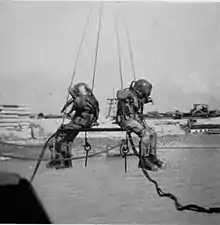 The Landing Force Shore Party Commander was OIC of the 8th Marine Field Depot.[11] The 8th Field Depot assigned a squad to liaison with each shore party by beach color. Each shore party had Marine JASCO (Joint Assault Communications Co) men attached as well as personnel from the 442nd U.S. Army Port Company.