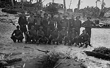 B Co was the major component of the shore party posted to 2nd Battalion 23rd Marines or 2/23 which was the right "Assault" battalion for yellow beach.[6] They also landed at 0935, but on blue 2 from the APA 207 – USS Mifflin and LSM-202.[20][17] That beach had a Homophone "Blew to" Hell beach. Mortar fire was so heavy they could not move to yellow 2, but were ordered to because, the situation became critical for the 4th Pioneers that had made it to y2. A Co. 4th Pioneers was split in two to share their combat experience/knowledge and was attached to B Co 133.[18] On D+1 LSM-202 landed 3 D8s and a crane for B Co. B Co's security sections landed the same as A Co and also went forward until needed. The USN beach party from the USS Mifflin was assigned to serve with B Co.[21] Also with B Co was a 32-man beach team from the 8th Marine Depot Company as well as B Co 24th Marines replacement draft. On D+1 the acting Shore Party commander on beach yellow 2 was wounded and command transferred to B Co. Commander 133.