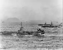 A Co was the major component of the shore party posted to 1st Battalion 23rd Marines or 1/23 which was the left "Assault" battalion for yellow beach. D-day they landed a 0935 on yellow beach 1 from APA 158 – USS Newberry[6][15][16][17] and LSM 206. A Co 4th Pioneers was split in two to share their combat experience/knowledge and was attached to A Co 133.[18] One of A Co's security sections (30 men) landed in 4 LCVPs with one 7-man gun crew and 37mm Gun M3 in each craft.[19] One LCVP took a direct hit killing the entire gun crew. 133's gun crews were immediately tasked with supporting the assault. A Co's other security section landed on the heels of the first wave and were the first Seabees to set foot on Iwo Jima. The Battalion cruise book states the security section was sent to the front line until their skills were needed on the beach. The USN beach party from the USS Newberry served A Co.[20] Also with A Co was a 32-man beach team from the 8th Marine Depot Company as well as A Co. 24th Marines replacement draft (1/24).