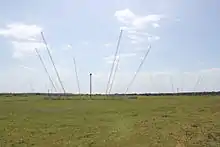The joint American, Italian, and NATO facility houses an AN/FRT-95A Low Frequency Radio Transmitting System,[2] hosts a USAF HF SCOPE Command, part of the High Frequency (HF) Global Communications System (HFGCS)[3][4] and a US Navy MUOS Ground Station. The surrounding antenna field supports one 827 foot LF antenna, 44 HF (3–30 MHz) antennas, three MUOS Earth Terminal parabolic antennas, and 2 UHF Directional Helical antennas for satellite direction finding. Several different types of HF antenna are installed, though the majority are no longer in use. 116 Antenna towers are installed which hold aloft 35 antenna transmission lines. Antenna types include four Horizontal Log Periodic (HLPA) with 2 tall towers each, four rotatable log periodic (RLPA), seven Horizontal Omnidirectional Broadband (HOBA) each with 4 antenna towers, seven High Take-Off Angle (HTOA), 11 Dual Mode (DM) antennae held aloft with 7 towers each, 1 Spira-cone, and 10 decommissioned Horizontal/Vertical HF Loop Antennae.[5] The LF Transmitter uses non-line-of-sight propagation for communication with submarines.