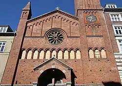 The church is designed with inspiration from Romanesque churches of Northern Italy. It is constructed in red brick and stands on a foundation of granite ashlars. The narrow facade towards the street consists of a gable motif flanked by a tall, slender tower to the right and a lower pinacle to the left. The facade features a relief with biblical motif created by Thomas Bærentzen (1869-1936). Over the entrance sits a Christ figure.[3]