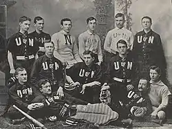 Baseball was established as the University of Nebraska–Lincoln's first organized sport in 1883.[2] Players were divided amongst three nine-player teams based on skill level and participated in scrimmages across campus. The first of these scrimmages was a 31–23 victory for the varsity team over the junior varsity team that had to be cut short because the only available bat broke.[2] This continued for several years until the Nebraska "Old Gold Knights" (the school's nickname until 1893) played their first intercollegiate baseball game in 1889, a 23–6 victory over Doane College (now Doane University). The program was loosely organized throughout its first decades; most of its early head coaches, including College Football Hall of Famer Edward N. Robinson, led the team for only a single year. In many seasons Nebraska did not play a single intercollegiate game.