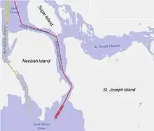 The completion in 1855 of the first ship canal and locks at Sault Ste. Marie (later known as the Soo Locks) enabled much larger ships to ply the St. Marys River. To accommodate them and to ease navigation, the American government dredged and dynamited limestone from the Munuscong Channel between Neebish and St. Joseph islands in 1856 and 1905.[12]