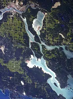 Centred is Neebish Island, Michigan. To the north is Sugar Island, Michigan. To the east is St. Joseph Island, Ontario. To the west and south is the eastern corner of Michigan's upper peninsula. The developed areas in the upper left area are the cities of Sault Ste. Marie in Ontario and Michigan.