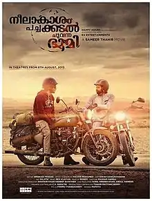 Neelakasham Pachakadal Chuvanna Bhoomi (transl.Blue Sky, Green Sea, Red Earth) is a 2013 Indian Malayalam-language road adventure film directed and co-produced by Sameer Thahir and written by Hashir Mohamed. The film stars Dulquer Salmaan and Sunny Wayne with Dhritiman Chatterjee, Surja Bala Hijam in supporting roles. The movie was a hit at the Kerala box office and has since developed a cult following among the youth of Kerala.[1] The film began shooting in the north-eastern state of Nagaland in February 2013 and completed its shoot in June 2013.[2] The film was shot at real locations in eight Indian states, Kerala, Karnataka, Andhra Pradesh, Tamil Nadu, Odisha, West Bengal, Nagaland and Sikkim.[3]