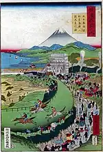 The completion of the Negishi Racecourse in 1866 provided the first permanent site for horse racing in Yokohama, replacing a temporary Swamp Ground site at the rear of the Kannai foreign settlement where the first races had been run in 1862.[1] Initially intended as an entertainment venue for the foreign community, the racecourse rapidly became popular with Japanese society; the Emperor Meiji visiting on 14 separate occasions.[2]