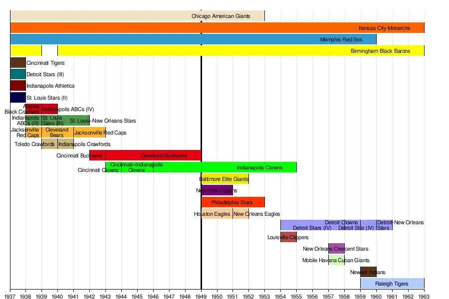 • 1937: Formation of NAL consisting of 8 teams — Birmingham Black Barons, Chicago American Giants, Cincinnati Tigers, Detroit Stars (III), Indianapolis Athletics, Kansas City Monarchs, Memphis Red Sox and St. Louis Stars (II).