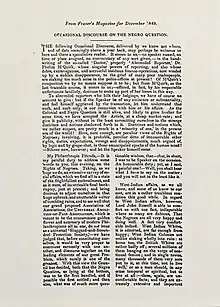 "Occasional Discourse on the Negro Question" is an essay by the Scottish essayist, historian and philosopher Thomas Carlyle. It was first published anonymously in Fraser's Magazine for Town and Country of London in December 1849,[1] and was revised and reprinted in 1853 as a pamphlet entitled "Occasional Discourse on the Nigger Question".[2] The essay was the spark of a debate between Carlyle and John Stuart Mill.[3] It was in this essay that Carlyle first introduced the phrase "the dismal science" to characterize the field of economics.[4]