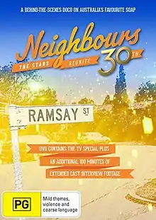 Producers FremantleMedia Australia confirmed in November 2014, that a special show celebrating Neighbours' 30th anniversary would air on Network Ten in March 2015.[1][2] The following month, it was announced that the special would be a 90-minute documentary.[3] Michael Lallo of The Sydney Morning Herald confirmed former co-stars Kylie Minogue, Jason Donovan and Guy Pearce would be involved.[2] Network Ten's drama chief Rick Maier commented that the documentary includes scenes from the show and "an affectionate nod" to Labrador Retriever Bouncer.[2] It also clears up some myths about the show's ratings after its move from Channel Seven to Network Ten.[2]