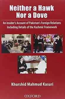 Neither a Hawk nor a Dove: An insider's account of Pakistan's foreign policy is a book written by Khurshid Mahmud Kasuri.[2] The book is the first comprehensive account by a Pakistani Foreign minister who contributed in moving the peace process with India forward. This was hailed as the most promising dialogue between Pakistan and India since Independence. It provides a detailed analysis of the Kashmir issue and the complex Pakistan-US-Afghanistan-India quadrangular relationship. Kasuri believes that, whenever two statesmen are at the helm in India and Pakistan, for improvement of relations, they would have to revert to the framework formulated during his tenure as Foreign Minister.
