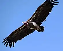 In art, Nekhbet was depicted as a vulture. Alan Gardiner identified the species that was used in divine iconography as a griffon vulture. Arielle P. Kozloff, however, argues that the vultures in New Kingdom art, with their blue-tipped beaks and loose skin, better resemble the lappet-faced vulture.[3]