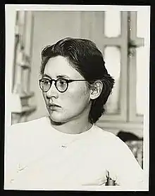 Blaine's work had begun as "tightly realist" but transformed to an abstract style, which was inspired by artists such as Piet Mondrian, Fernand Leger, and Jean Helion.[5] Blaine's association with the American Abstract Artists group led to her receiving her first solo exhibition, held at Greenwich Village's Jane Street Gallery, of which she was a founding member. It was the earliest known artists' cooperative in New York.[6] In these early years with the Jane Street Group, Blaine prescribed to an abstract style, later explaining, "[By 1944], I'm developing so fast in my tastes and I become more abstract all the time--to the point of great purification....", and about fellow Jane Street Group members, "[we] were very dogmatic about our program. Now, as I look back on it, I'm a little ashamed. But we were so excited we really thought that was the gospel, you know. When you're young you are very sure of yourself."[7] Blaine and many other young artists used the space to display and sell their works, raising funds from collectors and donors in New York and making a name for themselves through shared and solo exhibitions. At this time, Blaine was working alongside Ida Fischer, Judith Rothschild, and other Abstract Expressionist artists under 25 years of age.