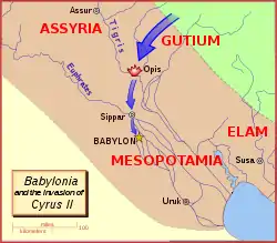 In 549 BC Cyrus the Great, the Achaemenid king of Persia, revolted against his suzerain Astyages, king of Media, at Ecbatana. Astyages' army betrayed him and Cyrus established himself as ruler of all the Iranic peoples, as well as the pre-Iranian Elamites and Gutians, ending the Median Empire and establishing the Achaemenid Empire. Ten years after his victory against the Medes, Cyrus invaded Babylon. Nabonidus sent Belshazzar to head off the huge Persian army, but the Babylonian forces were overwhelmed at the Battle of Opis. On 12 October, after Cyrus's engineers diverted the waters of the Euphrates, the soldiers of Cyrus entered Babylon without the need for battle. Nabonidus surrendered and was deported. Gutian guards were placed at the gates of the great temple of Marduk, where services continued without interruption.[33]