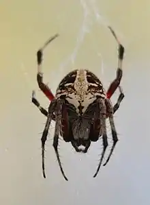 Adults can be identified by a bright white or yellow marking on the back of the abdomen. These markings generally have lateral broad, black stripes on either side with a thin transverse white band near the front making a pale cruciform shape.[2] The first segment of each leg is red while the remaining segments are banded in black and pale gray. The underside is dark with four white spots on the abdomen which is red at the tip.[4] As in other species in the genus Neoscona, there is a characteristic longitudinal groove on the carapace which separates them from species in Araneus.[5]