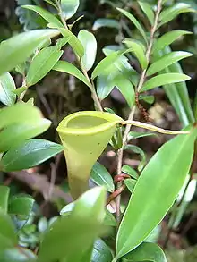 Nepenthes dubia produces thick, mucilaginous pitcher liquid similar to that found in related species such as N. inermis. The pitchers of N. inermis function not only as pitfall traps but also as flypaper traps, with the sticky inner walls trapping flying insects above the surface of the fluid. A similar trapping method may be employed by N. dubia.[8] Nepenthes like N. jamban also use this method with mucilaginous pitcher fluid.