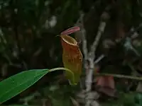 Upper pitchers are generally larger, growing to 8 cm in height and 4 cm in width. They gradually arise from the ends of the tendrils, forming a 5 to 10 mm wide curve.[2] They are tubular to infundibular in the lower parts with laterally appressed pitcher walls. As in N. inermis, there is almost no gap between the walls in mature pitchers. The upper part of the pitcher is widely infundibular throughout. Wings are reduced to ribs in upper pitchers. The inner surface of the pitcher is covered with numerous small, slightly depressed glands, occurring at a density of 600-900 per square centimetre;[2] it lacks a waxy zone.[10] The pitcher mouth is ovate, horizontal, and acute towards the lid.[2] It bears a cylindrical or involute peristome (≤4 mm wide) with indistinct teeth spaced 0.25 to 0.5 mm apart.[2] The inner portion of the peristome accounts for around 45% of its total cross-sectional surface length.[10] The lid is narrowly cuneate, without appendages, and up to 4 cm long and 0.7 cm wide. It is rounded at the apex, gradually attenuate towards the base, and bears numerous small round or elliptical glands on its undersurface.[2] Characteristically, it is almost always reflexed beyond 180 degrees relative to the pitcher mouth.[8] In upper pitchers, the unbranched spur is 3 to 5 mm long.[2]