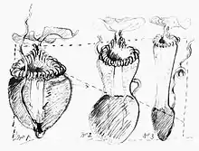Sketch of N. villosa (left), N. × harryana (centre), and N. edwardsiana (right) from Frederick William Burbidge's 1880 letter to Joseph Dalton Hooker