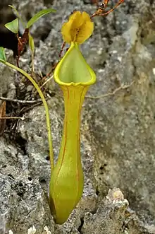 The tiny islets this species inhabits around Dinagat provide striking micro-habitats, often having near-vertical rock walls and highly vegetated tops. Here, N. viridis plants occasionally grow lithophytically,[1] their roots anchored in fissures.[7] Where present, surrounding vegetation provides support for the plants' scrambling vines, though these may overhang the sheer rock faces, dangling only a few metres from the water. Exposed to direct sunlight, the dark rock walls can get very hot, and during particularly dry periods any N. viridis plants in close proximity will largely wither, leaving only a few green shoots.[1]