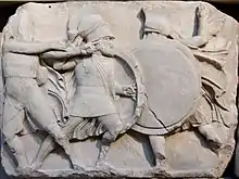 The larger and lower frieze on the podium was made up of 22 blocks, of which seven are lost apart from fragments. The surviving panels represent heroic battle scenes, with no apparent overall narrative, mostly involving male soldiers dressed in Greek costume and armour. Unlike many friezes from the same period, they are not pitched against Amazons, centaurs or obvious foreigners.[16]