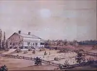 This house was owned by General John Coffin. Coffin was granted a tract on the Nerepis as a reward for services rendered the British during the American Revolution. The painting dates from 1839. New Brunswick Museum