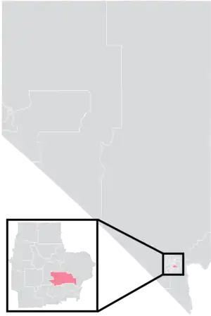 The district overlaps with Nevada's 1st and 3rd congressional districts, and with the 18th and 20th districts of the Nevada Assembly.[4] It has a surface area of 27 square miles (70 km2), and a perimeter of 31.5 miles (50.7 km).[5]