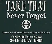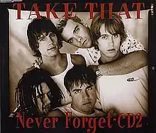 "Never Forget" is a song recorded by English boy band Take That, included as the sixth track on their third studio album, Nobody Else (1995). Written by Gary Barlow, it features Howard Donald on lead vocals. The song was released on 24 July 1995 and became the band's seventh number one on the UK Singles Chart, remaining at number one for three weeks. Robbie Williams left the band during the promotion of the song. Its music video was directed by David Amphlett.