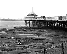 The pier was later leased to a subsidiary of Fortes, who reopened it in June 1968. Despite around £200,000 (equivalent to £3,154,800 in 2019) of improvements being made, the pier finally closed in November 1972.[1] Ferries across the Mersey to New Brighton had already ceased in 1971,[1] with the last ferry having left on 26 September 1971.[20] Despite proposals planned to be submitted to the Secretary of State for the Environment Peter Walker MP, designed to try and save the ferry by removing the sandbank and building two large retaining walls in a delta shape,[21] this ultimately did not come to fruition and the ferry pier with its landing stage were subsequently dismantled.[20] The pier closed in 1975 on advice from engineers who declared it as dangerous, with some metal being described as "wafer thin" from corrosion.[22]