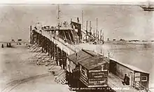 On 3 October 1867, the bridge and landing stage were destroyed by the steamer Galileo during a gale, with the landing stage floating out into the river, although it was rescued by other boats. The landing stage was repaired at a cost of £3,850 (equivalent to £385,000 in 2019) and reopened on 28 May 1868, although work to anchor it more securely to the seabed continued into 1869.[6] Famous divers were also known to have dived off the pier, including Tommy Burns[10] and Ted Heaton.[11] Various schemes to make the pier longer never materialised, resulting in the council often having to dredge sand from around the pier head so that ferries could continue to call.[12] Eventually in August 1881, £22,000 (equivalent to £2,429,200 in 2019) was borrowed to allow for the enlargement of the pier and landing stage.[13]