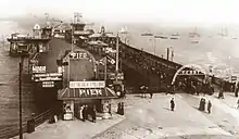 In 1892, a pavilion was added, described as a 130 feet (40 m) long covered saloon that was used for concerts and balls, among other events.[12] Passenger numbers from those landed by ferries for the year ending 31 March 1898 were over 2.7 million, which was an increase of over 300,000 from the preceding year.[14] The length of the promenade pier was extended to 660 feet (200 m) in 1900 so that it would reach the newly built promenade, which included a new pier entrance. In 1909–1910, the pavilion was refurbished, which included completely redecorating and installing a new heating system. On 16 March 1907, part of the landing stage collapsed which caused the pontoon to float down the river for some distance. The southern bridge also sustained significant damage and was replaced on 29 August 1907.[15]