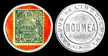 Between 1914 and 1923, postage stamps were used to make emergency issue currency.[3] The first issues were pieces of cardboard to which stamps were affixed in denominations of 25 and 50 centimes, 1 and 2 francs, with the 50 centime denominations made from either a single 50 centime stamp or a 15 and a 35 centime stamp.[3] The second issue from 1922 consisted of 25 and 50 centime stamps encapsulated in aluminum.[3]