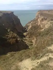 New Chine is a geological feature on the south west coast of the Isle of Wight, England ( the Back of the Wight). It is west of the village of Chale. It is a sandy coastal ravine, one of a number of such chines on the island created by stream erosion of soft Cretaceous rocks. It leads from the 190 foot high clifftop to a knickpoint approximately one third of way down the cliff face above Chale Bay beach.