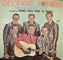 New Country Hits features Jones's first studio recording of "Take Me", a song he co-wrote with Leon Payne and would record more famously with Tammy Wynette. The album also includes the hits "Love Bug" (inspired by Buck Owens and the Bakersfield sound) and the self-pitying "Things Have Gone To Pieces". Although he stuck to country music with a vengeance, Jones did his best to record a wide range of songs under the country umbrella, stating in the 1989 documentary Same Ole Me, "I've always tried to be versatile. I've always tried to do up-tempos and novelties and ballads." The album is also noteworthy for its cover, which features the singer's backing band the Jones Boys. Like Buck Owens' Buckaroos and Merle Haggard's Strangers, Jones worked with many musicians who were great talents in their own right, including Johnny Paycheck, who played bass and sang harmony with Jones before going on to his own stardom in the 1970s. Paycheck is seated next to Jones on the cover of the album.