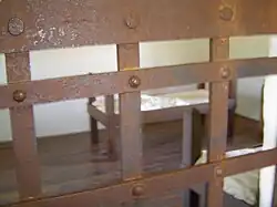 The New County Jail layout and exterior finish clearly depict its use as a jail. It is a three-story building of forty feet wide and twenty feet deep and across Main Street from the site of the old original wooden county jail. The construction of the building started in 1860, however it was not finished until 1867 due to the Civil War. The structure is made of brick and iron. It has at least two different brick types due to the long construction time. The prisoner jail cells with iron bars were on the top two floors. It also has an attic. The prisoner cells nor the second and third floors at all had any heat source. The first floor where the sheriff's office and quarters were have fireplaces.[6]