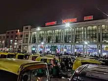 New Delhi's first round-the-clock service food court with national and international brands was opened up at the station in 2021.[62][63] Facilities include a souvenir shop,[64] book and magazine stalls,[65] two executive lounges,[66][67] waiting rooms,[68] at least one escalator per platform,[69] water vending machines,[70][71] snack areas,[21] and energy saving lighting systems.[72] In 2014 Wi-Fi connectivity was launched at the station on a free basis for a limited period of time after which users would be required to pay for the service.[73] The station is home to base kitchens.[74][75] As of 2021, the cargo facility is being redeveloped.[76] In 2003 the station was serviced by around 1450 licensed porters, with each porter earning more than ₹6,500 (US$81) per month.[77]