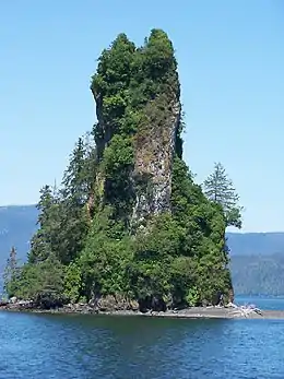 The volcano rises from the bottom of Behm Canal, about 850 feet (260 m) below sea level.[3] The island stands to 237 feet (72 m) above sea level, giving the volcano a total height of over 1,000 feet (300 m). While the portion of the volcano below sea level is somewhat cone-shaped, wave action over the millennia has eroded all the rock above sea level except the dense, spire-shaped volcanic plug.[1]