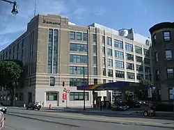 The New England Confectionery Company Factory, also known as the NECCO Candy Factory, is an historic factory complex at 250 Massachusetts Avenue in Cambridge, Massachusetts. The property is now owned by DFS Advisors, and is under long-term lease to Novartis. The complex, which includes the factory building, a power plant, and a modern (2003) parking garage, occupies most of an entire city block bounded by Massachusetts Avenue, Cross Street, Albany Street, and Lansdowne Street. The Moderne-style building was constructed of reinforced concrete, faced predominantly with beige brick and trimmed with limestone. On some facades smooth concrete predominates as the finish surface. The building had a water tower that was painted to resemble a roll of Necco Wafers; during the alterations of the property for use by Novartis, the water tower was retained, and is now painted with a DNA pattern in pastel colors.[2] The building was listed on the National Register of Historic Places in 2005.[1]