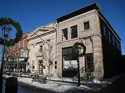 The New Hampshire Bank Building is prominently sited in downtown Portsmouth's Market Square, on the east side of the square, one building south of Daniel Street. Due to its extensive history of alteration, the building now has two different facades, one next to the other. When built, it was a two-story brick structure, with a five-bay front facade, of which the center three bays were recessed. The recessed area was covered by a roof, which sheltered entrances into the projecting outer bays. In 1869 the building was partitioned into two ground-floor spaces, with front-facing entrances to those, and a third center entrance providing access to the upper floor. In 1903 the building was widened, and the left side restyled in the Classical Revival. The right side was renovated in 1904, giving that half a granite Beaux Arts facade.[2] In the 30-foot (9.1 m) lobby hangs a giant stained glass dome depicting the New Hampshire State Seal.[3]