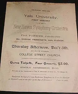 The first performance of the NHSO took place January 25, 1895 at a now-defunct theater on Chapel Street in New Haven near the present-day Union League Café. The program included works by Bach, Beethoven, Mendelssohn, and Schubert, as well as two solos performed by Isidore Troostwyk, a Dutch-born violinist who had recently arrived as a Professor of Music at Yale. Troostwyk served as concertmaster of the new orchestra.
