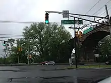 Route 175 begins at an off-ramp from Route 29 and Aberfeldy Drive in the capital city of Trenton. Inside the city limits of Trenton, the route carries one-way traffic northbound and is maintained by the City of Trenton.[1] The route heads northward, progressing through the northern residential districts on Sanhican Drive. The highway continues, paralleling Route 29 for a distance. At an intersection with Afton Avenue, the continuation of Abernethy Drive, Route 175 changes names from Sanhican Drive to River Road. The road becomes two-way, enters Ewing Township, and is maintained by the New Jersey Department of Transportation (NJDOT). The highway continues, intersecting with County Route 643 (CR 643, Lower Ferry Road) in Ewing. A short distance later, both routes pass under the West Trenton Railroad Bridge, which carries CSX's Trenton Subdivision and SEPTA's West Trenton Line, and head along the Delaware River, passing to the south of several high-end mansions. Route 175 itself passes to the south of condominium complexes, intersecting with the access road shortly afterward.[2]