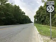 Route 55 begins at a signalized intersection with Route 47 in the Port Elizabeth section of Maurice River Township, Cumberland County, heading to the north as a two-lane undivided road through wooded areas.[1][4] At the southern terminus, the road continues south as part of Route 47. A short distance after beginning, the road widens into a four-lane divided freeway and comes to a southbound exit and northbound entrance with Schooner Landing Road.[1] Past this interchange, Route 55 enters Millville and crosses over the Manantico Creek as it heads into built-up areas. The freeway continues north to an interchange with Route 49.[1][4]