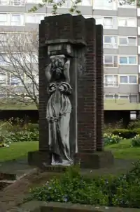Crossway United Reformed Church was the last part of the Heygate Estate that remained standing, until it closed in 2017 and was relocated to a new building nearby. The Two Caryatids sculpture by Henry Poole, originally created in 1897 for the old Rotherhithe Public Library, stood in a locked garden behind the church for many years, but was removed in 2009[10]