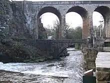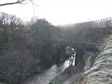 Before the construction of the high-level bridges the Torrs was a major obstacle; traffic had to descend 70 feet (21 m) to cross the Goyt and then climb the same height on the other bank. The first bridge to be constructed was the Queens Bridge on Church Road. The Union Road bridge was built in 1884;[7] obtaining the land was difficult, as the arches needed to pass close to Torr Mill and properties on the Cheshire (south) bank, and Torr Top Hall had to be demolished. The new road was named after the 'union' of the two halves of the town. The first station in New Mills was at Newtown, on the Stockport, Disley and Whaley Bridge Railway; this opened 9 June 1855. This followed the line of the Peak Forest Canal staying safely away from the Torrs. The Sheffield and Midland Railway Companies' Committee company built two viaducts across the Goyt: one for a line to New Mills Central that opened in 1864, and one for the fast line through the Disley Tunnel which opened in 1904.