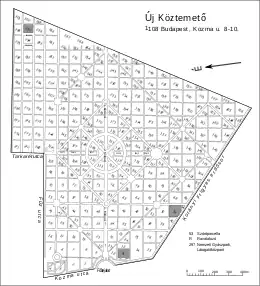 New Public Cemetery (Hungarian: Új köztemető or Rákoskeresztúri sírkert) is the largest cemetery in Budapest and one of the largest in Europe with an area of about 2.07 km2 and 3 million burials since its opening in 1886. It is adjacent to the Kozma Street Cemetery; the largest Jewish cemetery in Hungary. Its main building, which was constructed in 1903, has a 26-meter-high bell tower. In addition to its rich vegetation and wide avenues, the cemetery is famous for plot 301, where the martyrs of the 1956 revolution were buried. Today, an enormous modern monument by György Jovánovics marks their graves.