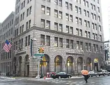 When New York Law School reopened in 1919, it was located in another building at 215 West 23rd Street, in Midtown.[12] However, George Chase contracted an illness that resulted in him running New York Law School for the last three years of his life from his bed; he died in 1924.[13] New York Law School continued without Chase, seeing its enrollment peak in the mid-1920s, but it saw a steady decline after that. At the onset of the Great Depression, the law school began seeing a serious decline in enrollment, which forced the law school to accept a much lower quality of students than they had previously accepted. With much fewer and poorer performing students, the law school moved to smaller facilities at 253 Broadway, just opposite City Hall.[14] In 1936, the law school moved to another location at 63 Park Row, on the opposite side of City Hall Park; it also became coeducational that same year. However, as enrollment was still declining, both because of the Great Depression and because of the military draft started in 1940, and the school closed in 1941. The remaining students that were still enrolled finished their studies at St. John's University School of Law, in Brooklyn.[15]